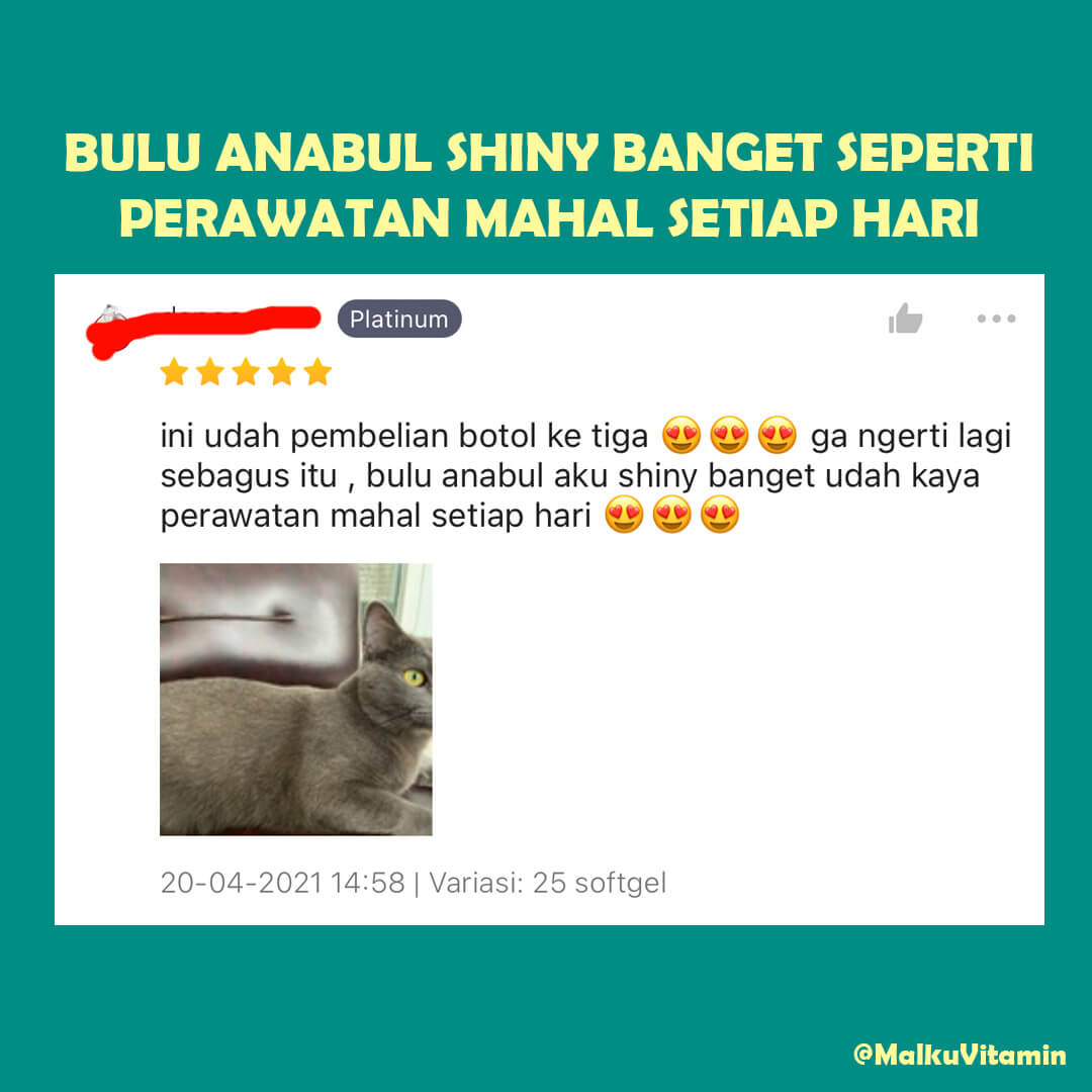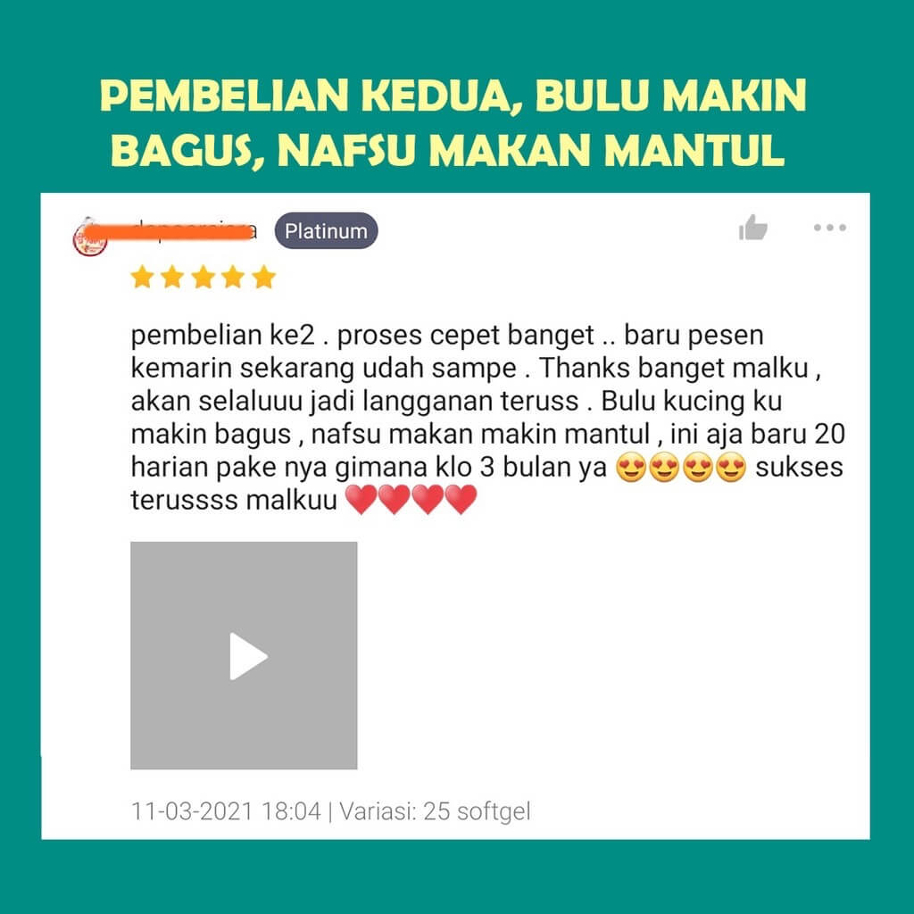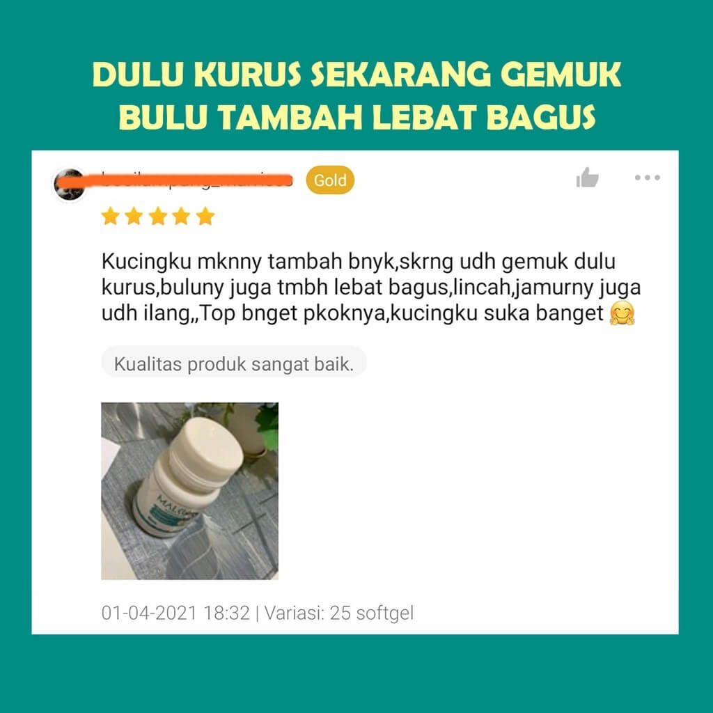 MALKU Salmon Oil adalah vitamin yang dirancang khusus untuk memaksimalkan pertumbuhan bulu kucing Anda sehingga bulu makin lebat dan rontok berkurang drastis.