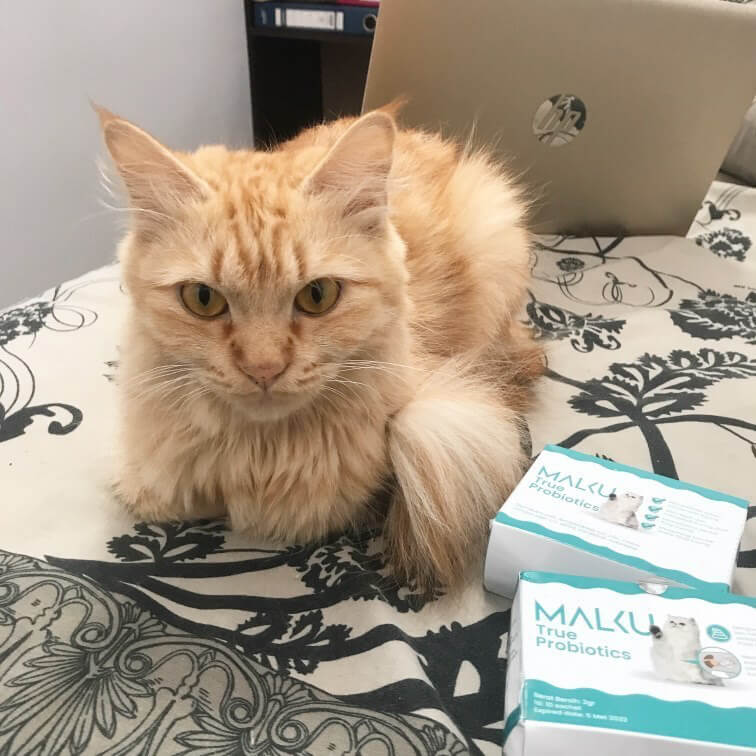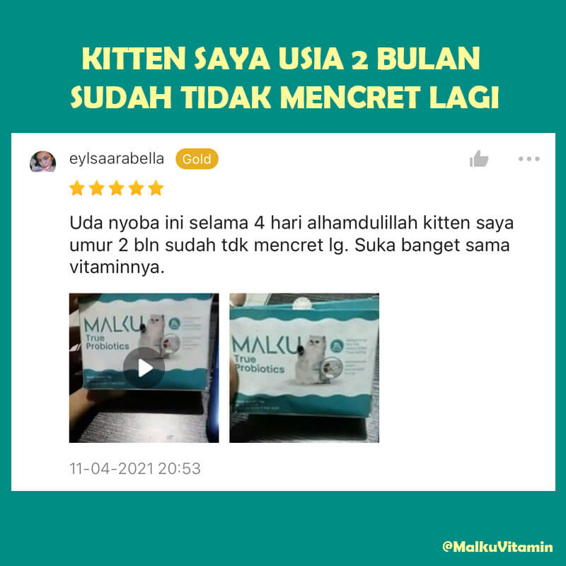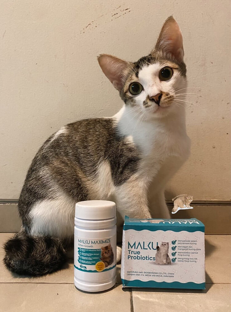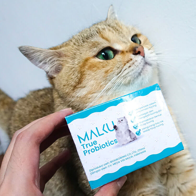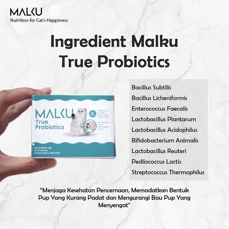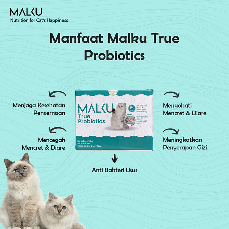 MALKU True Probiotic adalah vitamin yang dirancang khusus untuk mendukung kesehatan pencernaan kucing Anda sehingga pup tidak lagi mencret dan bau pup berkurang.